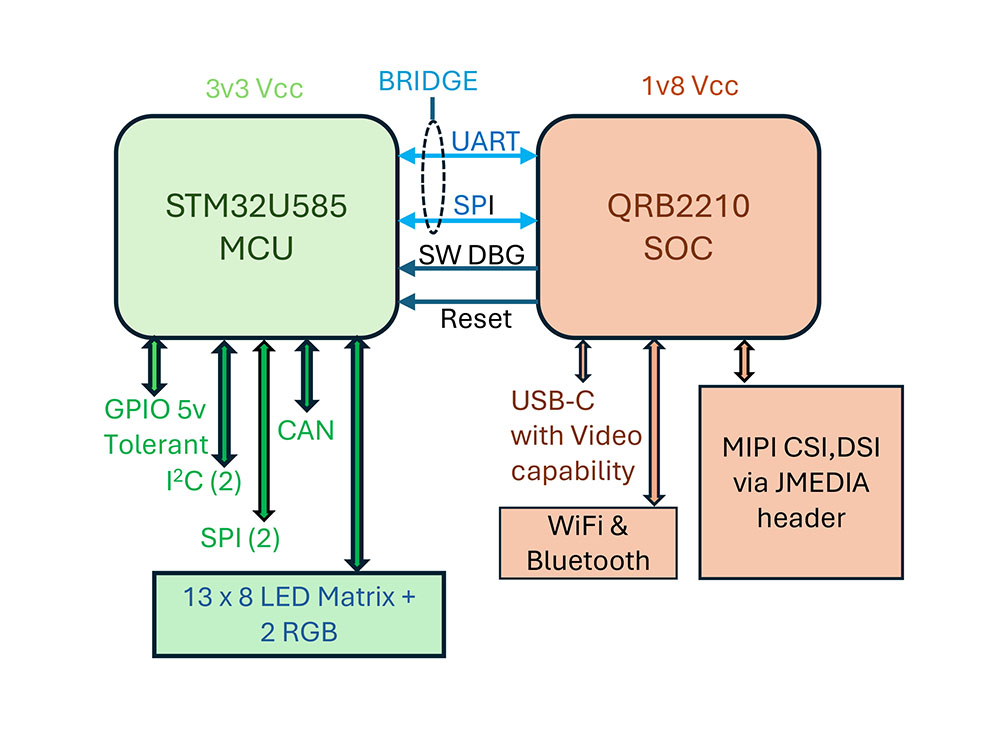 Slika 1 prikazuje fotografijo te plošče. Razpored priključkov teh konektorjev je v bistvu enak kot pri originalni Uno plošči, zato je mogoče na to ploščo priključiti in na njej uporabljati veliko različnih Arduino ščitov. Vendar pa se tu podobnosti med ploščama končajo. Morda vas bo zanimalo, da se shema originalne plošče Uno udobno prilega na eno A4 stran. Shema Uno Q pa se razteza na 24 straneh! V tem članku bom predstavil stvari, ki sem jih odkril med pregledovanjem te nove plošče, od katerih mnoge niso omenjene v prvotni dokumentaciji Arduina.