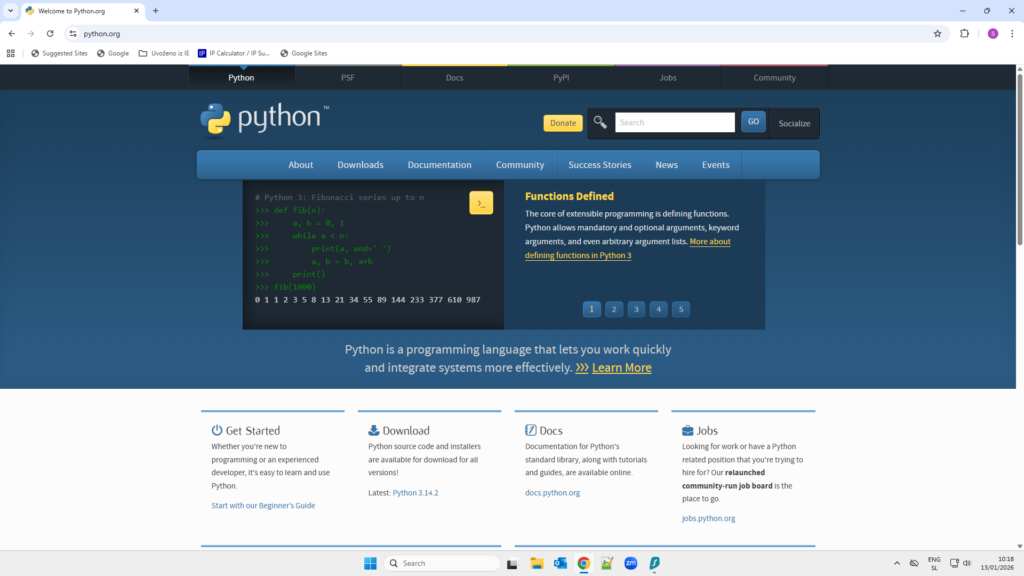 Python je konec osemdesetih let preteklega stoletja Guido van Rossum začel razvijati na osnovi programskega jezika ABC. Njegova popularnost pa je pripomogla k temu, da smo leta 2008 dobili že njegovo tretjo različico Python 3, ki jo danes poleg starejše Python 2 iz leta 2000, poganjajo skoraj vsi računalniki z Linuxom, v Windows 10 in 11 pa ju moramo namestiti posebej. Od letos (2026) Python Software Fundation, v skladu s petletnim razvojnim ciklom, zagotavlja popravke različic 3.10, 3.11, 3.12, 3.13 in 3.14, medtem ko jih za starejše različice ni.