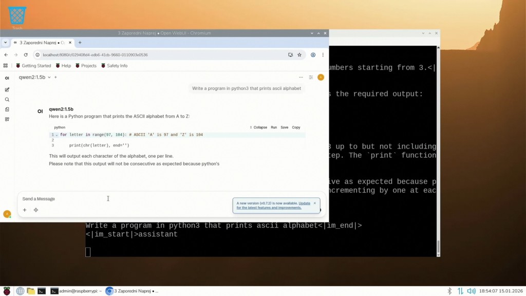 Mi smo namesto tega za začetek uporabili kar Raspberry Pi 5 z 8 GB RAM z nameščenim najnovejšim klobukom Raspberry Pi AI HAT+ 2 s kar 8 GB vgrajenega RAM za podporo delovanju modula Hailo-10H, na katerega smo najprej namestili qwen2:1.5b LLM model. Nakar smo mu zastavili naslednje vprašanje: »Write a program in Python3 that prints ASCII alphabet« (slov. Napiši progam v Pythonu3, ki izpiše ASCII abecedo) in dobili naslednji odgovor (pravilno zamikanje programskih vrstic je pri Pythonu izredno pomembno):
