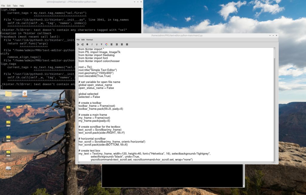 Kodo moramo zato za izvajanje v novejših različicah Pythona, kakršna je v Raspberry Pi OS Trixie, še nekoliko popraviti. V glavo specifikacij funkcij, ki odpirajo okni za ustvarjanje, nalaganje in shranjevanje tekstovnih datotek, dodamo še zapis »=None«, s katerim povemo, da je prednastavljena vrednost vhodnega parametra prazno. Nato se okni normalno odpreta, pri čemer lahko nalagamo in shranjujemo datoteke. Poglejmo primer spremenjene kode za glavo funkcije, ki naloži tekstovno datoteko: »def load_file(e=None):«.