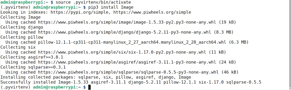 Naslednji korak je namestitev vseh potrebnih programskih knjižnic v navidezno okolje, kar lahko storimo le prek ukaznega okna, do katerega pridemo prek menija Tools/Open system shell. V oknu moramo naprej aktivirati pravkar izdelano navidezno okolje, kar storimo z ukazom source (npr. source .pyenv/bin/activate). Zdaj lahko uporabimo na primer ukaz pip3 install Image, ki namesti programsko knjižnico Image.