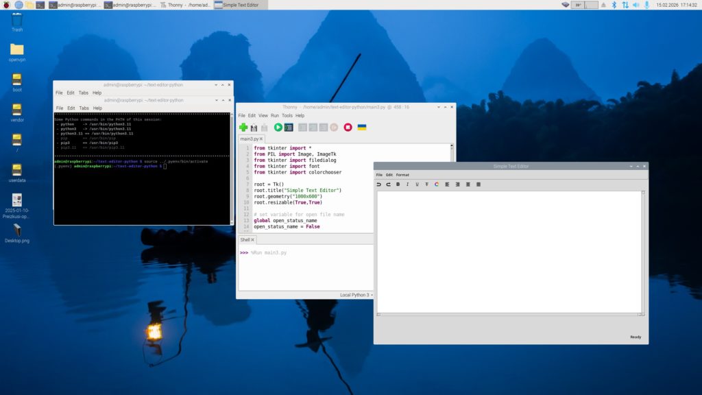 Čeprav se nam zdijo okenski programi v Windows nekaj samoumevnega v Linuxu pogosto ne vemo, kje začeti. Raspberry Pi 500+ z nameščenim operacijskim sistemom Trixie je lahko v veliko pomoč pri preizkušanju programske kode v Pythonu3, saj je ta že prednameščen. Včasih moramo dodati le še kako programsko knjižnico, kar storimo z ukazom pip install . V našem primeru potrebujemo le programsko knjižnico Tkinter, ki del standardne knjižnice Pythona 3, zato je ni potrebno nameščati. Poglejmo program: