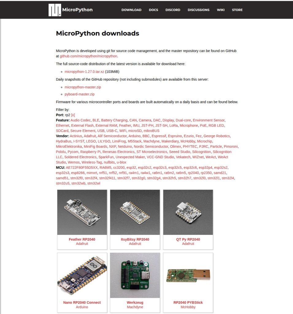 Najprej se podamo na spletno strani micropython.org/download/RPI_PICO2, iz katere prenesemo izvedljivo datoteko z interpreterjem za MicroPython (različica Pythona je 3) za jedra ARM ali za jedra RISC-V. Mimogrede povejmo, da imajo Raspberry Pi Pico 2 štiri procesorska jedra, od katerih lahko naenkrat delujeta samo dve. MikroPython je na voljo za par jeder ARM in par jeder RISC-V. Tako lahko vselej izberemo tisto procesorsko arhitekturo, ki nam najbolj ustrezna.