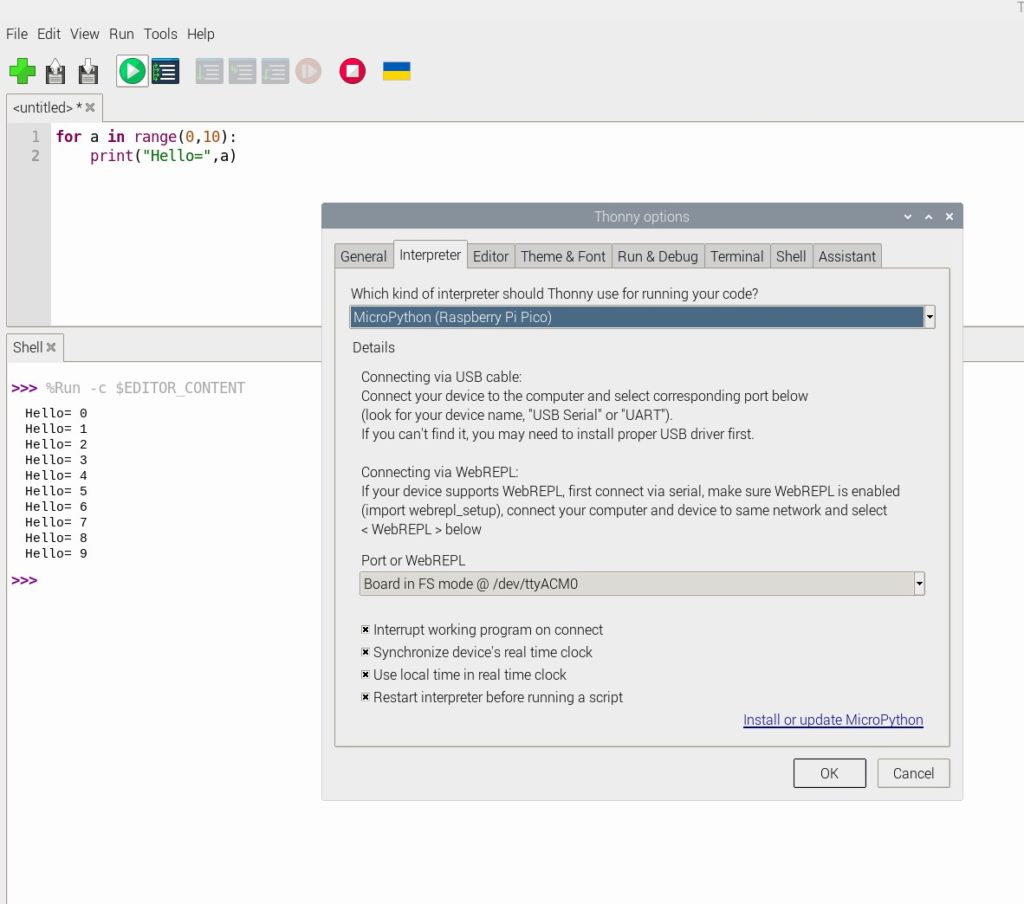 Za izvajanje programov v MikroPythonu moramo na Raspberry Pi Pico (2) najprej namestiti interpreter za MycroPython, nato pa lahko računalnik neposredno povežemo z razvojnim okoljem Thonny pred logične povezave CDC. Programska koda v Pythonu tako nastaja na gostiteljskem računalniki, izvaja pa jo vselej Raspberry Pi Pico (2).