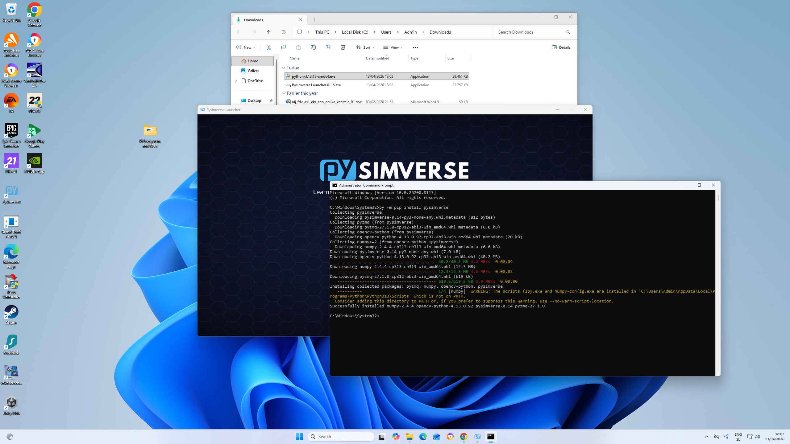 Manjka še Python, katerega zadnjo produkcijsko različico (3.14) za Windows ali macOS lahko prenesemo iz spletne strani python.org. Ker ima veliko sprememb, je pogosto bolje namestiti nekoliko starejšo različico (3.13). Sledi namestitev knjižnice pysimverse z ukazom: py –m pip install pysimverse, ki na klasičnem PC steče brez težav, na računalnikih Windows 11 za ARM arhitekturo pa moramo paziti, da namestimo Python 3.13.13 za arhitekturo x64 in ne tistega za ARM64, saj v nasprotnem že prevedenih t.i. koles (angl. wheels, oz. python knjižnic) ni na voljo.