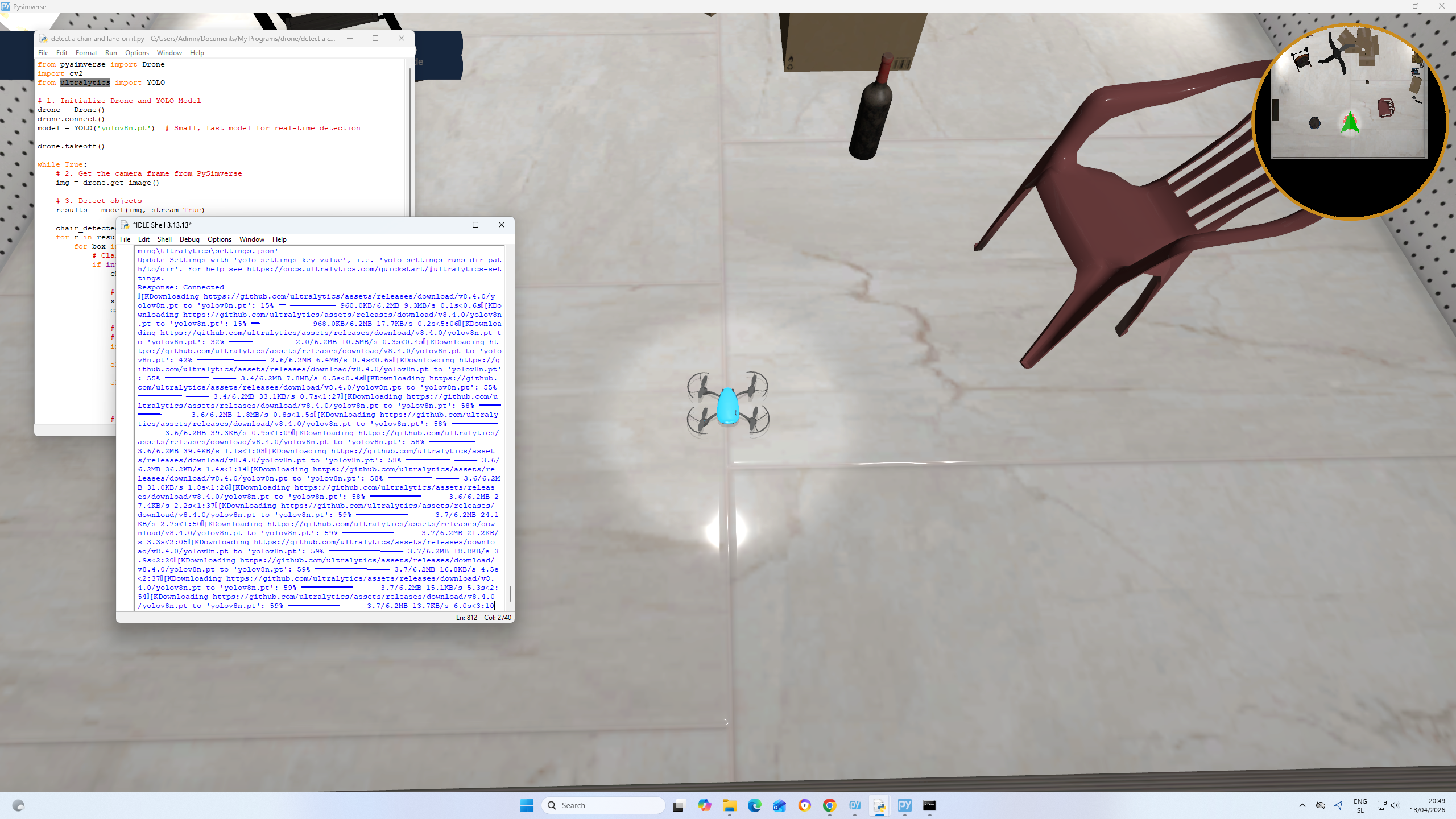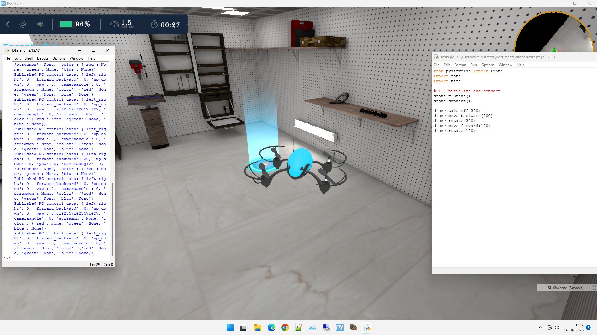 Simulator Pysimverse 0.14 in Python 3.13.13 nam je tako uspelo naložiti na klasični PC in Orange Pi 6 Plus ter z navideznim dronom uspešno preleteti krog v navideznem prostoru.