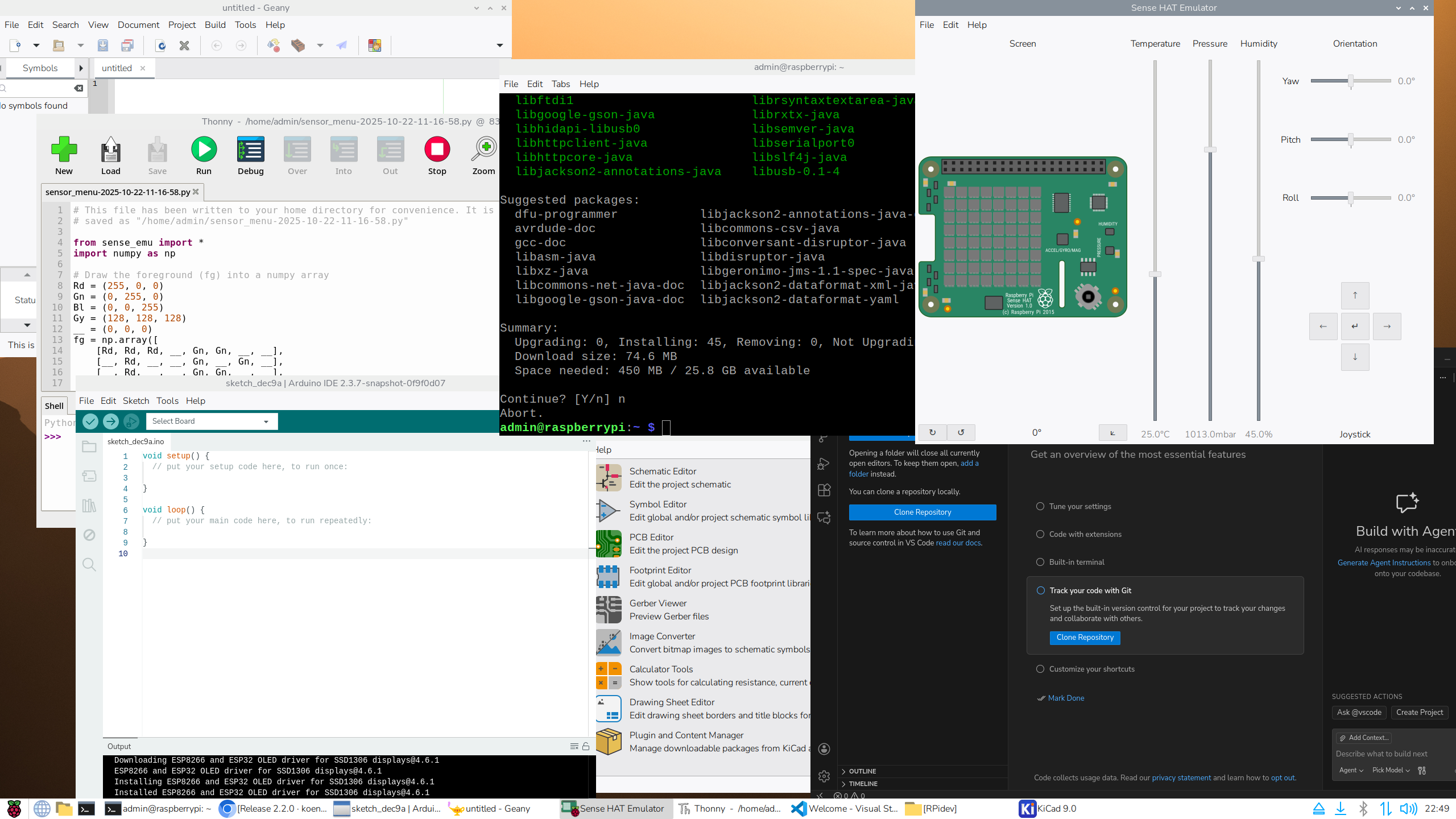 Zato na Raspberry Pi 500+ brez težav namestimo tudi programske pakete za dizajniranje in načrtovanje tiskanih vezij kot sta KiCAD in FreeCAD pa tudi okolja za razvoj programske opreme, kot so popularni Visual Studo Code, Arduino IDE 2, Thonny, ESP IDF, … Programiranje enostavnih naprav, kot so ESP32 in Arduino moduli in razvojne plošče lahko izvedemo neposredno prek 40-polne razširitvene vtičnice, pri čemer ne potrebujemo vmesnika.