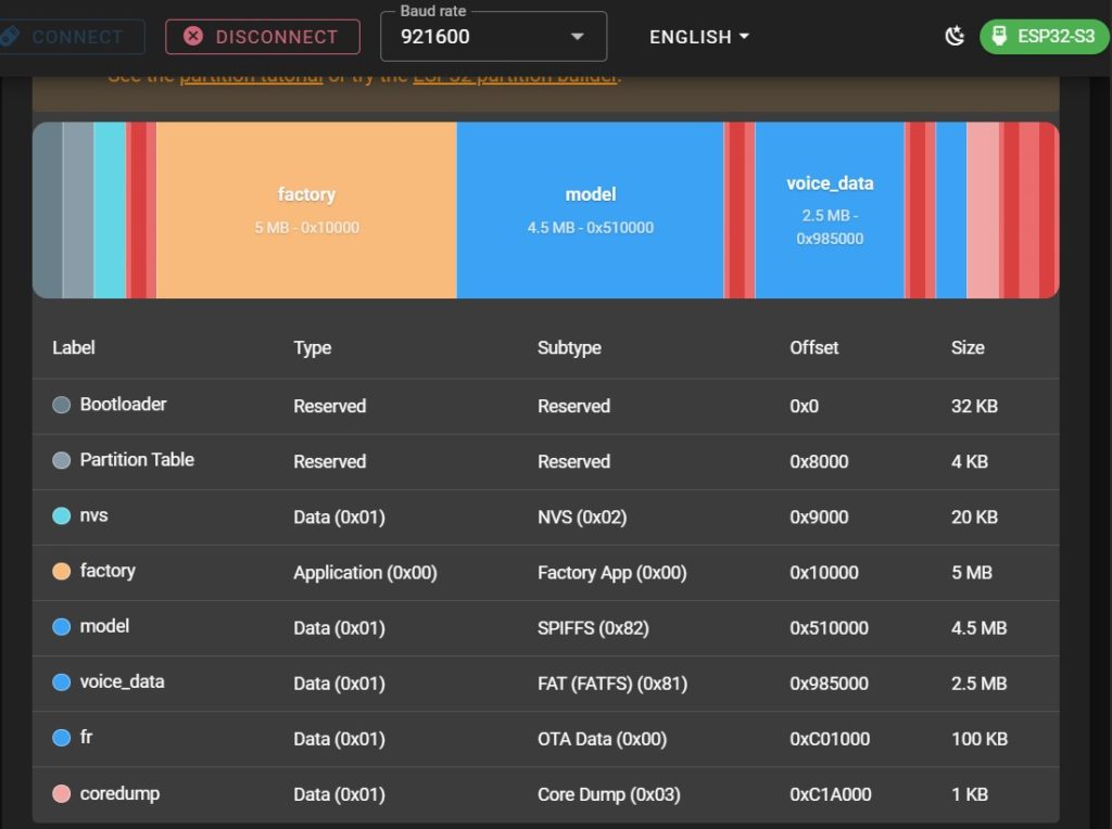 Ko naložite program v Flash pomnilnik ESP32S3, se postopek razlikuje glede na izbrani model. Če izberete »none«, bo programiranje potekalo tako, kot bi pričakovali. Če pa izberete EN ali CN, bo različica esptool, vsebovana v K10 BSP, delovala nekoliko drugače. Opazili boste, da izvaja programiranje v 3 različnih pomnilniških območjih in da traja veliko dlje kot običajno. To se zgodi, ker nalaga model sklepanja in »glasovne« podatke v dve ločeni particiji. Z uporabo brskalnika espconnect sem pridobil particijski zemljevid ESP32S3, pri čemer je bil model nastavljen na EN.