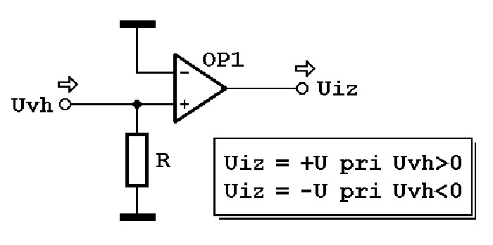 Predznak vhodne napetosti lahko ugotovimo z enostavnim vezjem, ki ga vidimo na sliki 22. V tem primeri je operacijski ojačevalnik OP1 povezan kot primerjalnik (komparator), ki primerja napetosti na svojih vhodih. »-« vhod je trajno priključen na 0 V, vhodno napetost pa pripeljemo na »+« vhod. Ko je napetost na »+« vhodu vsaj malce višja od 0 V, bo operacijski ojačevalnik to razliko močno ojačil in na izhodu se bo pojavila najvišja mogoča pozitivna napetost. Kako visoka bo ta napetost je odvisno od napajalne napetosti in uporabljenega operacijskega ojačevalnika: pri TL082 bo približno 1-2 V nižja od pozitivne napajalne napetosti.