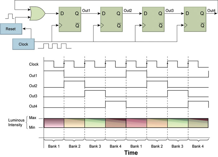 To tehniko lahko poceni izvedemo z generatorjem takta, digitalnimi flip-flop vezji za nadzor LED bank, ALI vrati za zaznavanje začetnega pogoja in preprostim stikalom za vklop in izklop. Slika 1 prikazuje blok shemo z D flip-flopi in konfiguracijo za nadzor štirih LED bank.