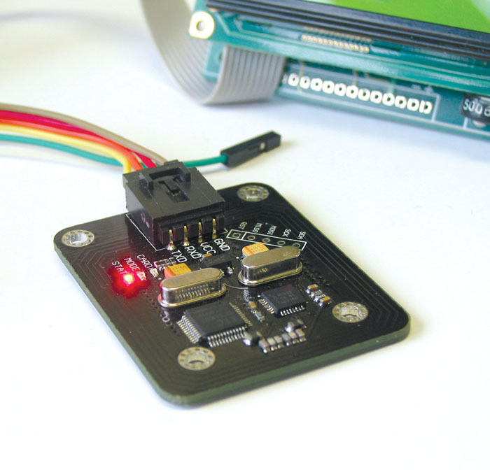 RFID moduli ima dimenzije 40×50 mm in podpira komunikacijo preko UART ali SPI vodila. Če uporabimo UART, lahko modul napajamo s 5V neposredno iz naše razvojne plošče. Pri komunikaciji preko SPI pa modul napajamo in z njim komuniciramo s 3,3V TTL nivoji, vendar tega nisem preizkušal in moram verjeti podatkom proizvajalca. Modul ima 3 LED indikatorje: napajanje (STAT), način delovanja (MODE) in prisotnost kartice (CARD). CARD LED se vklopi, ko v bližino RFID čitalnika položimo RFID kartico. Domet RFID čitalnika je približno 1-2 cm, kar je dovolj, da opravimo identifikacijo kartice preko zaščitnega ohišja in tako lahko ohišje RFID modula popolnoma zapremo in zaščitimo pred atmosferskimi vplivi. MODE LED se vklopi, če RFID modul deluje v režimu “enostavnih” ukazov. Kaj to pomeni? V osnovi RFID modul deluje s standardnim naborom ukazov, ki omogoča branje, pisanje v kartico pa tudi v EEPROM kartice, medtem, ko je enostavni nabor ukazov namenjen res osnovnim manipulacijam z RFID kartico, kot npr.: ugotavlja prisotnost neke določene RFID kartice in v primeru njene prisotnosti se vklopi LED. Sam nisem uporabljal enostavnega nabora ukazov, ker sem potreboval pisanje in branje v/iz RFID kartice.