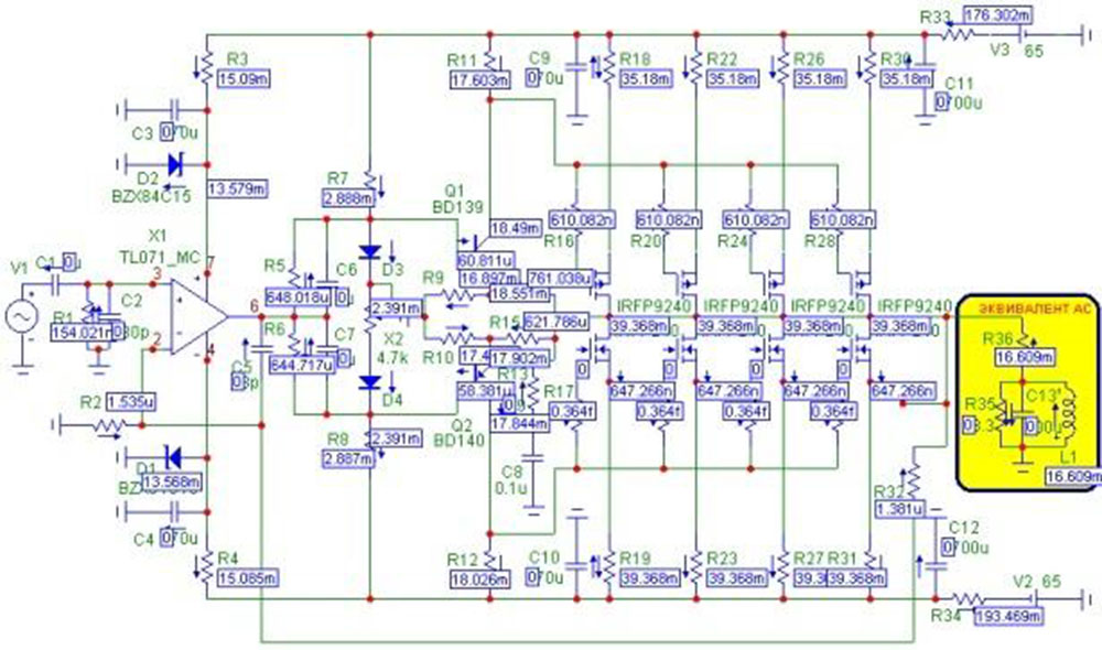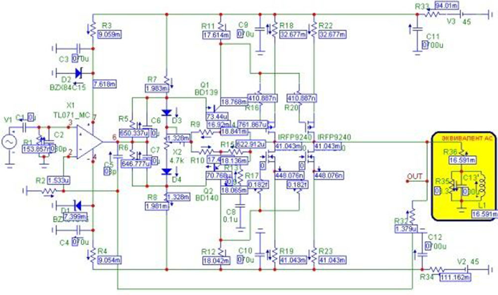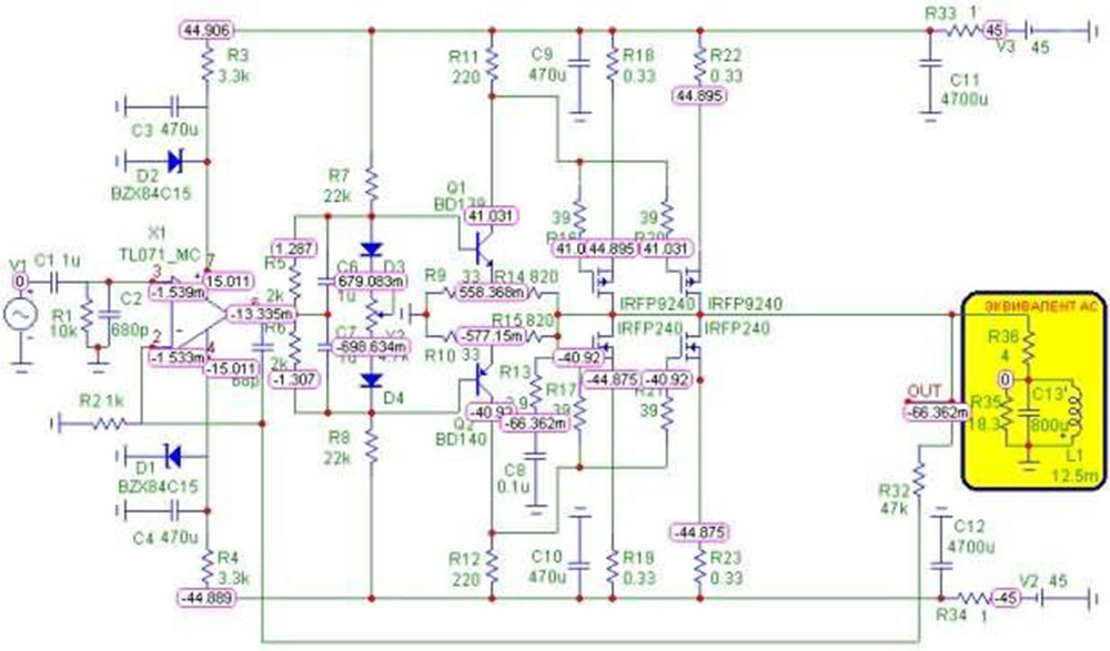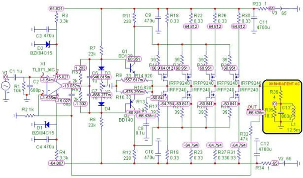 Na slikah 4 in 5 so prikazane napetosti na shemi za različico 200 W ojačevalnika z napajalno napetostjo ± 45 V in dvema paroma izhodnih tranzistorjev ter 400 W ojačevalnika z napajalno napetostjo ± 65 V. Obe različici sta obremenjeni z ekvivalentom zvočnika (rumeni pravokotnik). Morda je vredno omeniti, da je model uporabil tranzistorje IRF640-IRF9640, ki so ekvivalenti IRFP240-IRFP9240, vendar z manjšo izgubo moči zaradi toplote na siliciju, saj imajo ohišje TO-220 v primerjavi z TO-247. Kljub temu so IRF640-IRF9640 v simulatorju popolnoma opravili naloge, ki so jim bile dodeljene, in se lahko uporabljajo tudi v ojačevalniku kot izhodni tranzistorji.