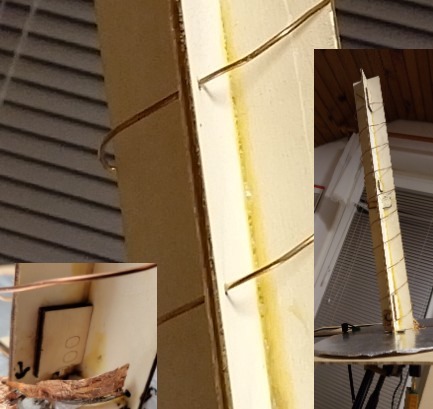 Uporabil sem bakreno žico inštalacijskega kabla. Za lažje navijanje skozi utore na nosilcu, sem žico predhodno navil na okroglo pločevinko podobnega premera, kot je premer ovoja antene. Nato sem žico počasi, z veliko potrpljenja, potisnil skozi luknje nosilca (slika 1).