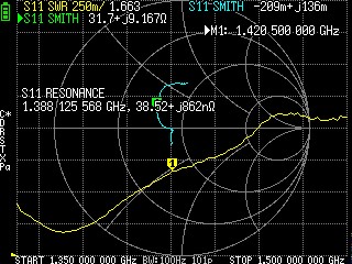 Z metodo trikotnika sem uspel impedanco antene znižati na 38 Ω in dosegel SWR cca. 1.6 (slika 2). Vidimo, da resonančna frekvenca 1,388 GHz odstopa od želene frekvence 1,420 GHz. To ne predstavlja večje težave, ker sta SWR in impedanca antene pri želeni frekvenci še vedno v sprejemljivih okvirih (38 Ω in SWR 1,6).