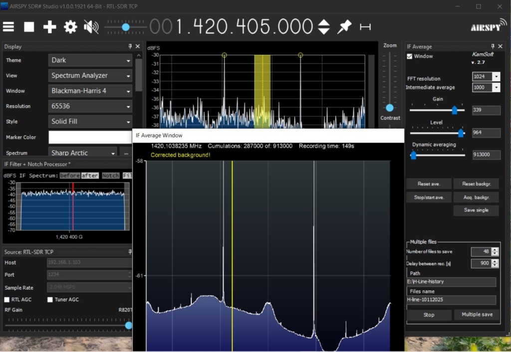 Po nastavitvah in kliku na opcijo Window se odpre novo okno, kjer vidimo potek povprečenja signala. Po koncu se izpiše na odprtem IF oknu obvestilo, da je postopek snemanja šuma ozadja končan. Rezultat je bolj ali manj gladka krivulja. Lahko nadaljujemo s sprejemom našega signala na 1,4204 GHz.