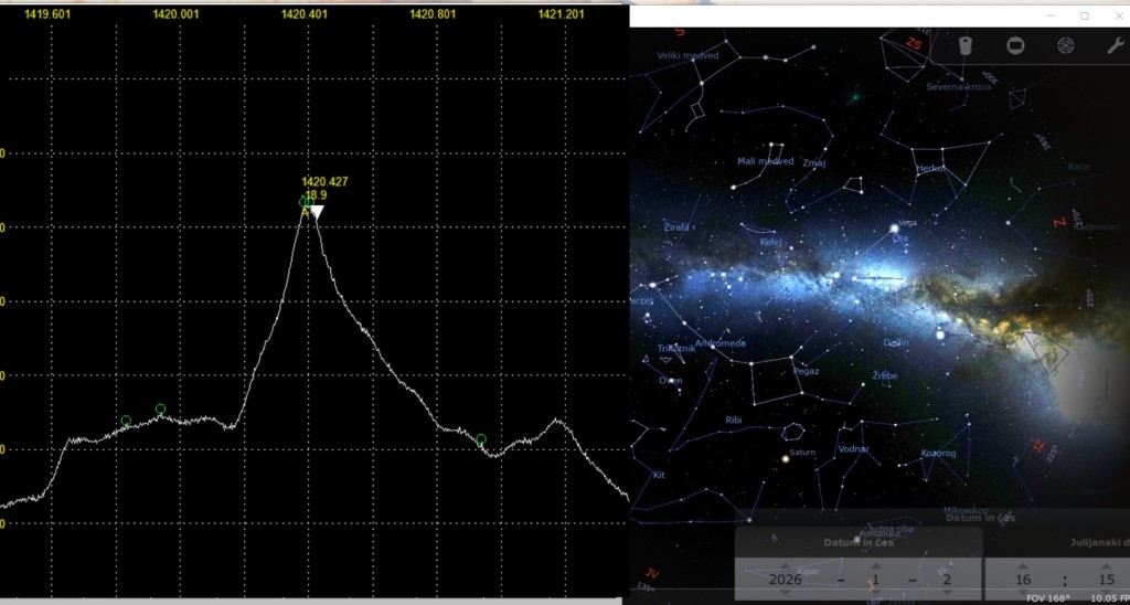 S programom, namenjenim za sprejemnik RSP1A, »RSP spectrum analyzer«, sem ulovil signal, ki bi lahko bil, kar iščemo. 2.1.2026 med 16:00 in 17:00 sem zaznal spektralno črto oz. »zvon«, ki se je nahajala v področju nastavljene frekvence sprejema, tj. 1,4204 GHz (slika 5). Uporabil sem vzorčenje 6Mb/s in pasovno širino 2Mhz. FFT sem imel nastavljen na visoko ločljivost >121000 (poskušal tudi z nižjimi in višjimi vrednostmi), povprečenje signala sem imel nastavljeno na 100 vzorcev, kar je največ, kar ta program nudi. Signal je bil sorazmerno stabilen in se razen amplitude frekvenca ni spreminjala. Če sem anteno zavrtel v drugo smer, je signal izginil. Če ni šlo za kakšen signal satelitov ali druge oddajne opreme ali harmonikov, bi to lahko bil signal vodika. Azimut in višina antene sta se ujemala z lokacijo Rimske ceste. »Sumljiv« je bil edino sprejem v zelo ozki in natančni smeri. Že z rahlim odmikom je signal izginil oz. se prestavil v drugo frekvenčno področje.