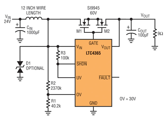 Slike niLTC4365 je edinstvena rešitev, ki elegantno in robustno ščiti občutljiva elektronska vezja pred nepredvidljivo visokimi ali negativnimi napetostmi na napajalnih priključkih. LTC4365 blokira pozitivne napetosti tudi do 60V in negativne napetosti celo do -40V. Le napetosti, ki so v varnem območju delovanja napajanja lahko pridejo do bremena. Edina zunanja aktivna komponenta, ki je potrebna, je dvojni N-kanalni MOSFET priključen med dovodom napajanja in občutljivim bremenom. Slika 1 prikazuje shemo vezja te aplikacije. Uporovni delilnik določa točki za priklop / odklop bremena pri prenapetosti (OV) in prenizki napetosti (UV) od VIN. Če je vhodna napajalna napetost izven tega napetostnega okna, LTC4365 v hipu odklopi breme od vhodnega napajanja. Dvojni N-kanalni MOSFET blokira tako pozitivne kot negativne napetosti na VIN. LTC4365 zagotavlja 8,4V za krmiljenje vrat zunanjega MOSFET-a med normalnim delovanjem. Dovoljen razpon delovanja LTC4365 je od 2,5 V do 34V in OV-UV okno se lahko nastavi kjerkoli v tem območju. Dodatna zaščita na VIN pri večini aplikacij ni potrebna, kar le še poenostavlja načrtovanje tiskanega vezja.