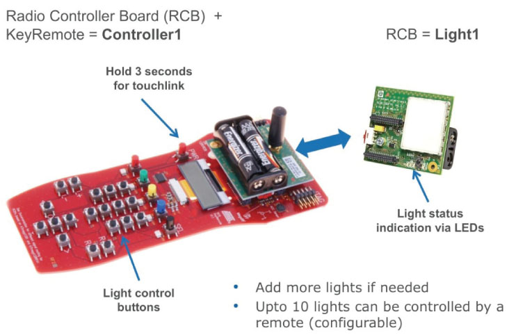 Ko se šele odloča o tem, ali vključiti ZigBee Light Link povezavo v nov proizvod, priporočamo inženirjem, ki še ne poznajo dobro ZigBee, uporabo predstavitvene ploščice z referenčno zasnovo, ki je na voljo pri številnih dobaviteljih mikrokontrolerjev. Atmel ima na primer predstavitveni kit RF4CE-EK, kjer je uporabljena rešitev, ki temelji na njihovem ATmega128RFA1 brezžičnem SoC z uporabo ZigBee PRO sklada, imenovannega BitCloud. V kompletu je referenčna aplikacija imenovana „ZLLDemo“ vsebuje overjene implementacije krmilnika barvne svetlobe in barve scene. Ploščico daljinskega upravljalnika (RCB) iz kompleta za krmilnik barvne scene, je treba povezati s Key Remote krmilno ploščico. Aplikacija Color Light je na voljo v dveh različicah: kot samostojna RCB ploščica – v tem primeru je vgrajena LED na ploščici kot vir svetlobe, ter izvedba za sestavljanje RCB ploščice skupaj s ploščico Key Remote Control skupaj z LCD prikazovalnikom.